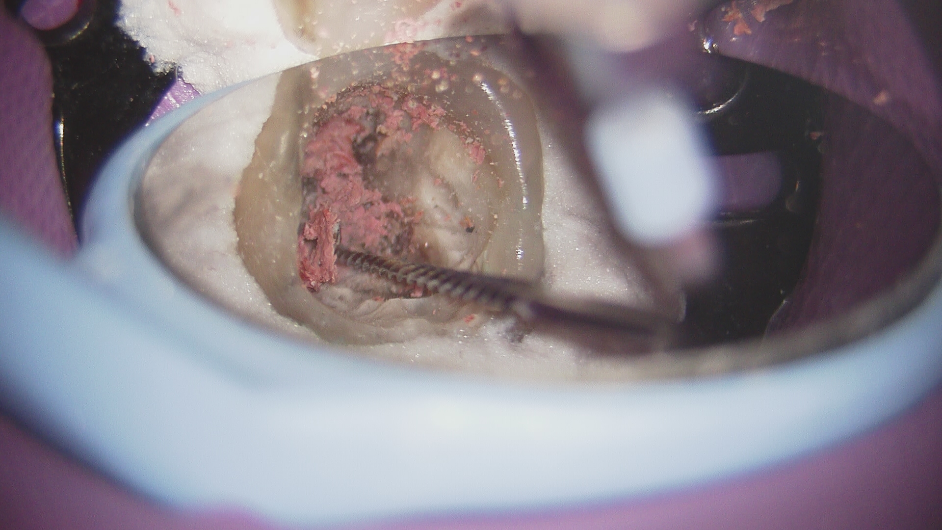 以前に詰めていたお薬や、根の先に貯まった膿を取り除きながら、根管内の洗浄・消毒を繰り返します。