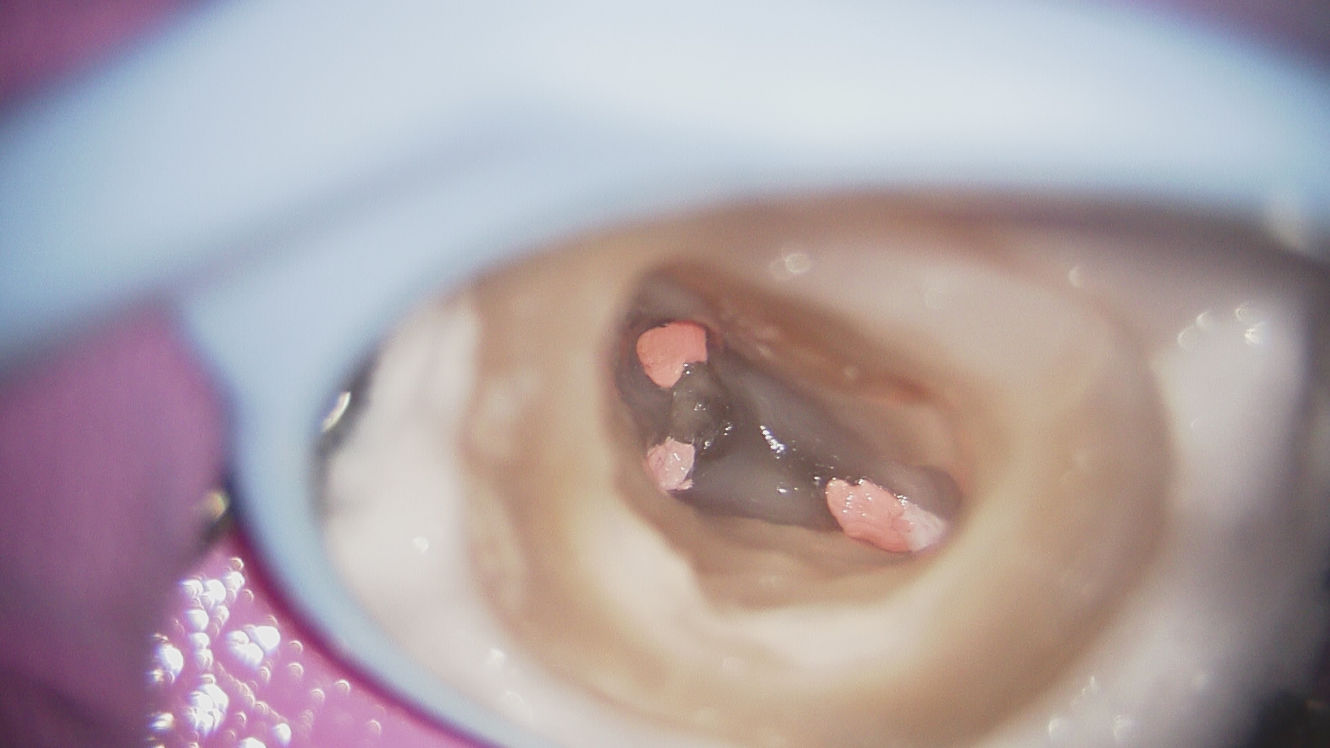 根管内の消毒・洗浄を何度か行い、処置後の痛みや根尖部からの出血、排膿がないことを確認したら、最終的なお薬を詰める作業に入っていきます。